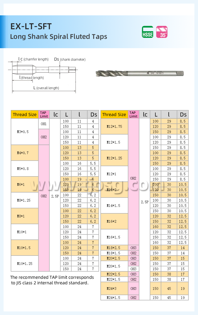 Product description: This tap is used when a standard spiral fluted tap is too short. Suitable for tapping blind holes in Materials such as medium carbon steel, copper, aluminum alloy casting, thermo plastic , etc.